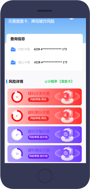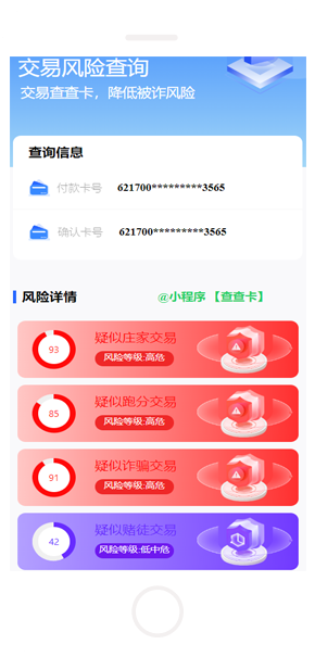 预防冻卡,预防收黑钱,反诈安全预警提示。一键查询银行卡风控信息,手机即可操作,快速,安全,可靠